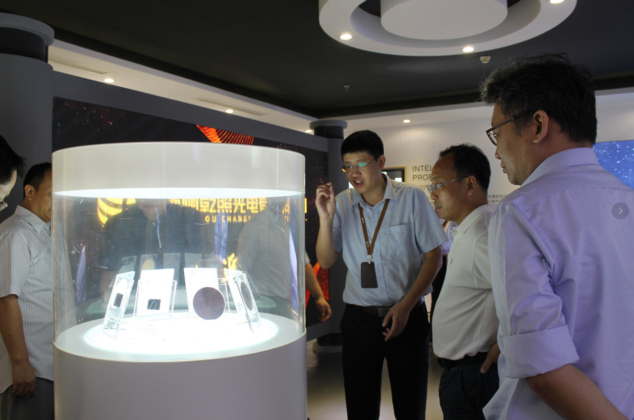 隨后,巡視組一行參觀了公司展廳。馬祥柱為大家講述了揚州乾照光電創業十年的歷程、成績以及榮譽,并介紹了公司各類產品的型號、樣式以及應用領域。巡視組成員們通過顯微鏡觀察了公司芯片成品芯粒,對一片四寸圓片能切出幾十萬顆芯粒的生產工藝贊嘆不已。