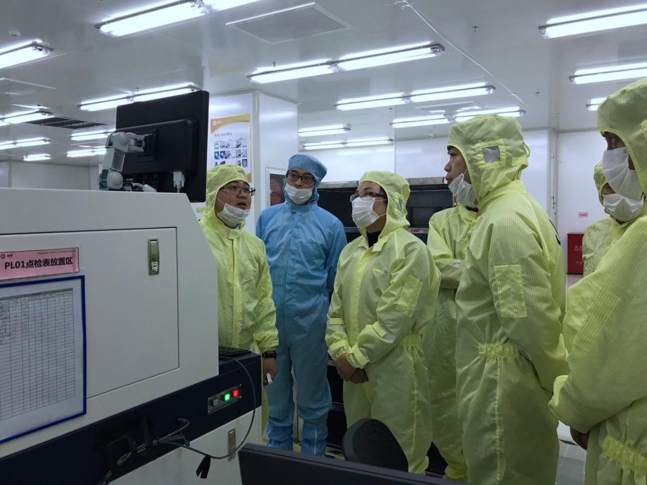 在展廳,李局長認真聽取了公司企業文化、項目建設規劃、產品技術優勢及應用領域的介紹。隨后,調研組參觀了外延生產車間,并詳細了解了外延片的生產制作流程和質檢工作程序。李局長對江西乾照光電的迅速發展、現代化生產和智能化工序表示了高度的贊揚。