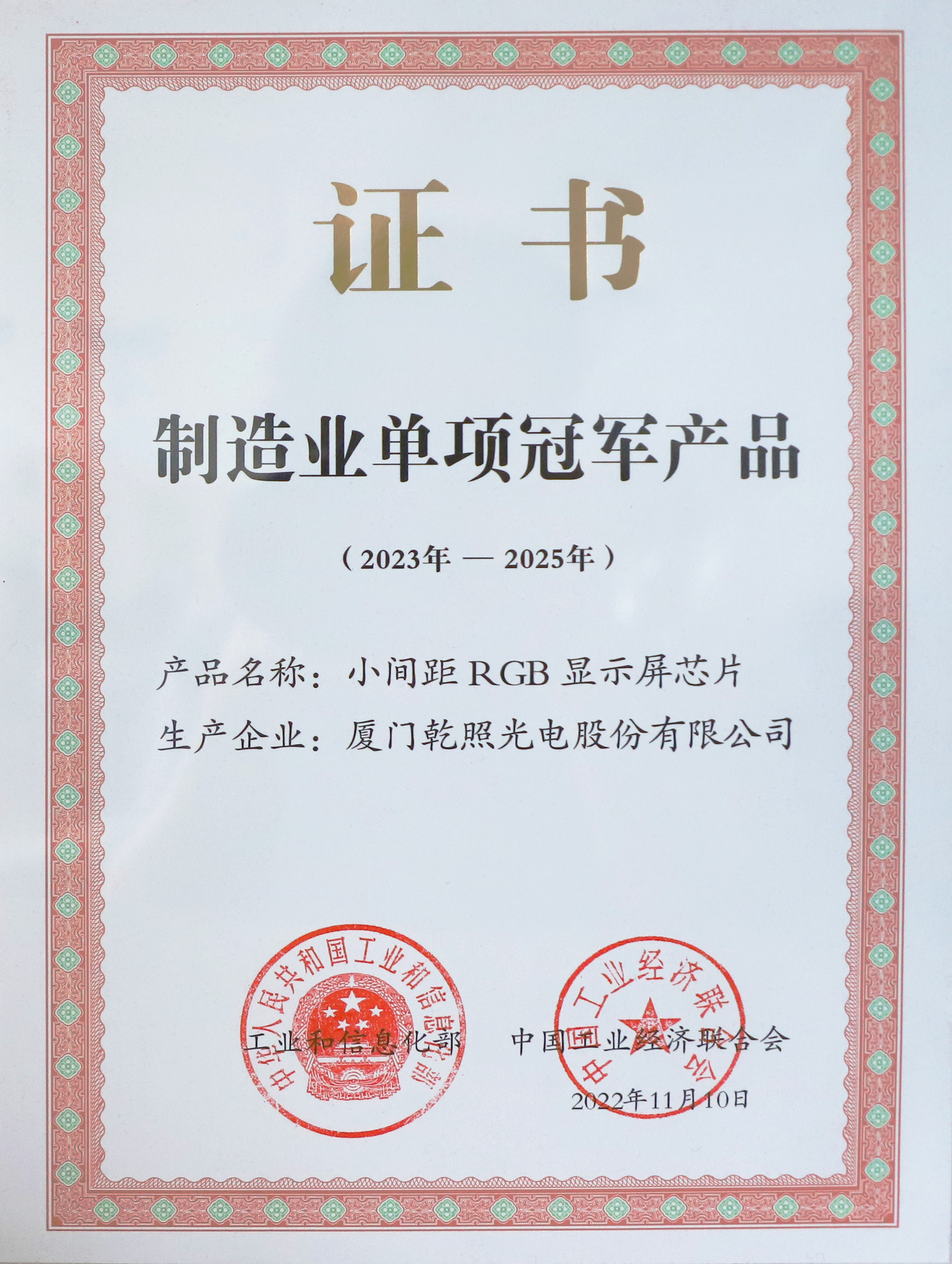 乾照光電“小間距RGB顯示屏芯片”成為國家級制造業單項冠軍產品