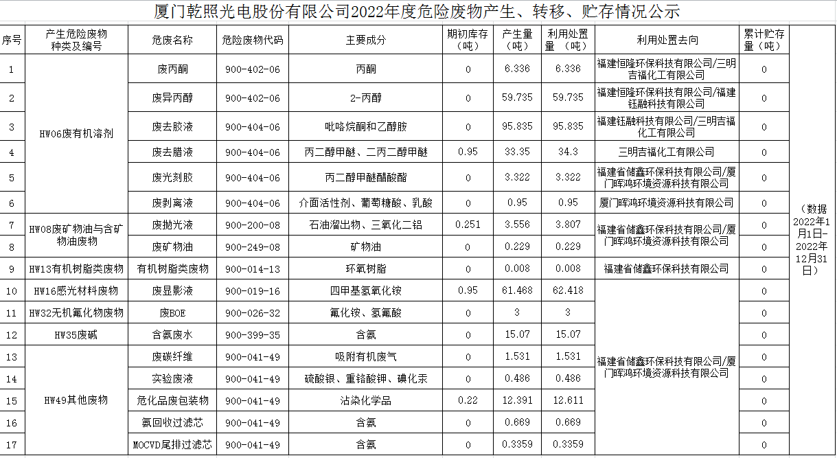 廈門乾照光電股份有限公司2022年度危險廢物產生、轉移、貯存情況公示