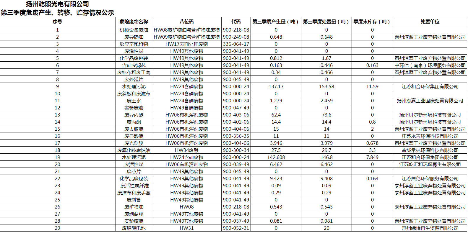 揚州乾照光電有限公司2023年第三季度危廢產生、轉移、貯存情況公示