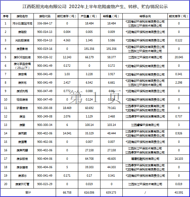 江西乾照光電有限公司2022年上半年危險廢物產生、轉移、貯存情況公示
