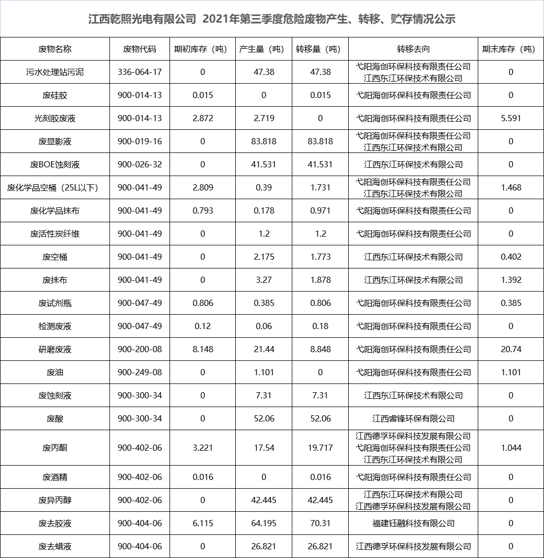 江西乾照光電有限公司 2021年第三季度危險廢物產生、轉移、貯存情況公示
