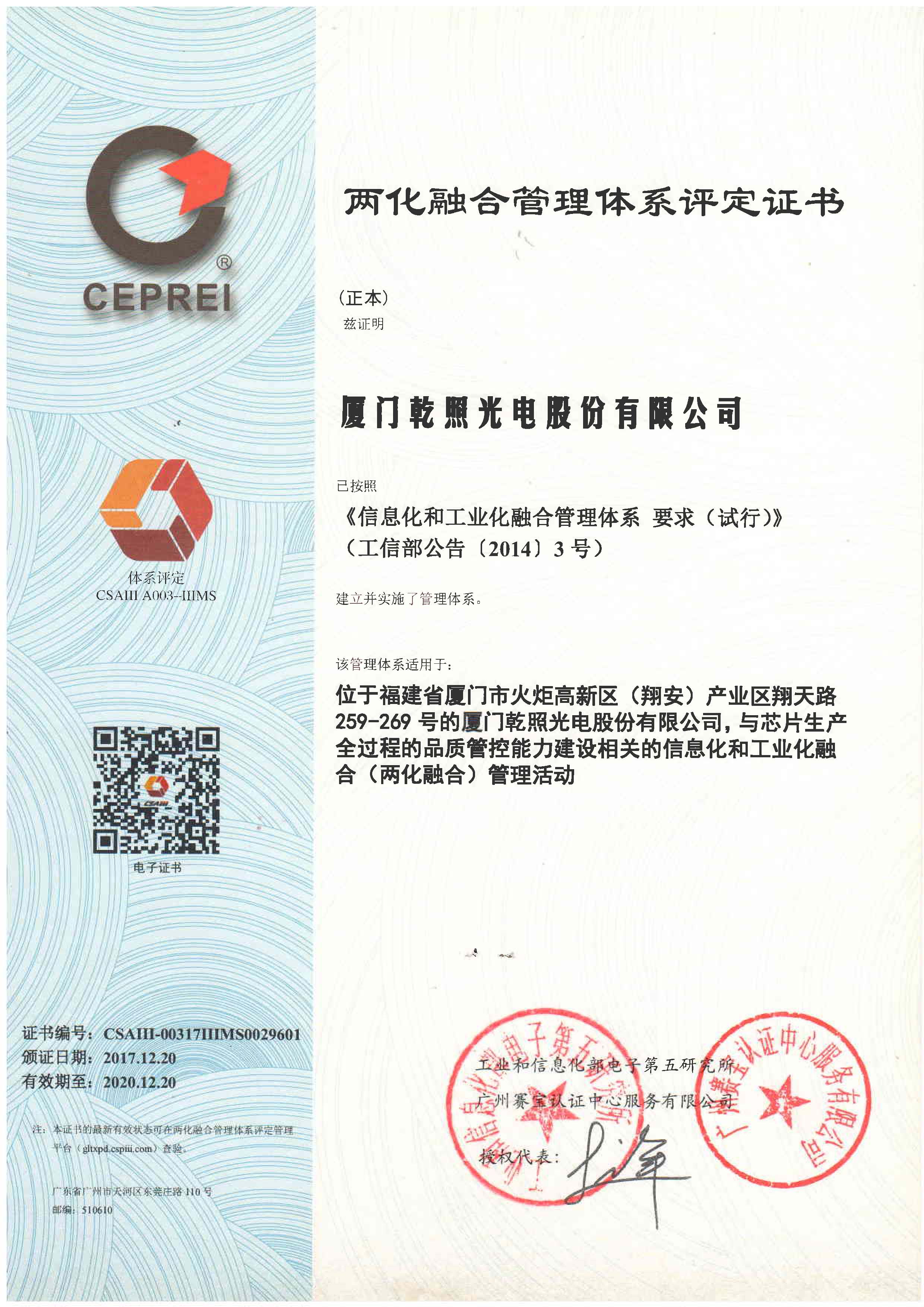 乾照光電獲得兩化融合管理體系評定證書