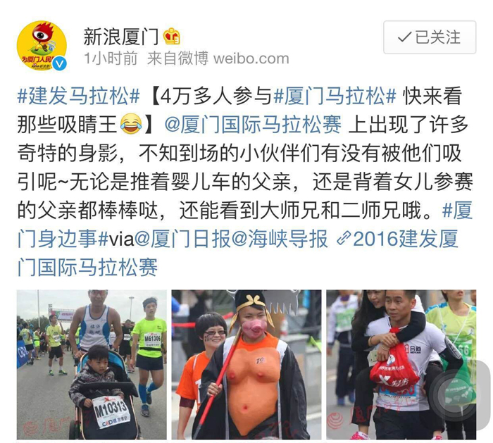 當(dāng)然,這也離不開所有參賽選手們的齊心協(xié)助與辛苦付出。在賽道上,他們獨(dú)樹一幟,彰顯個(gè)性。在蕓蕓人海中,賺足了大眾的眼球。二師兄還上了當(dāng)日新浪廈門官方微博頭條呢。師徒仨及我司的吉祥物也被廈門網(wǎng)、廈門晚報(bào)等媒體報(bào)道啦。這不僅僅展示了參賽者的活力,更彰顯了我司的品牌魅力。