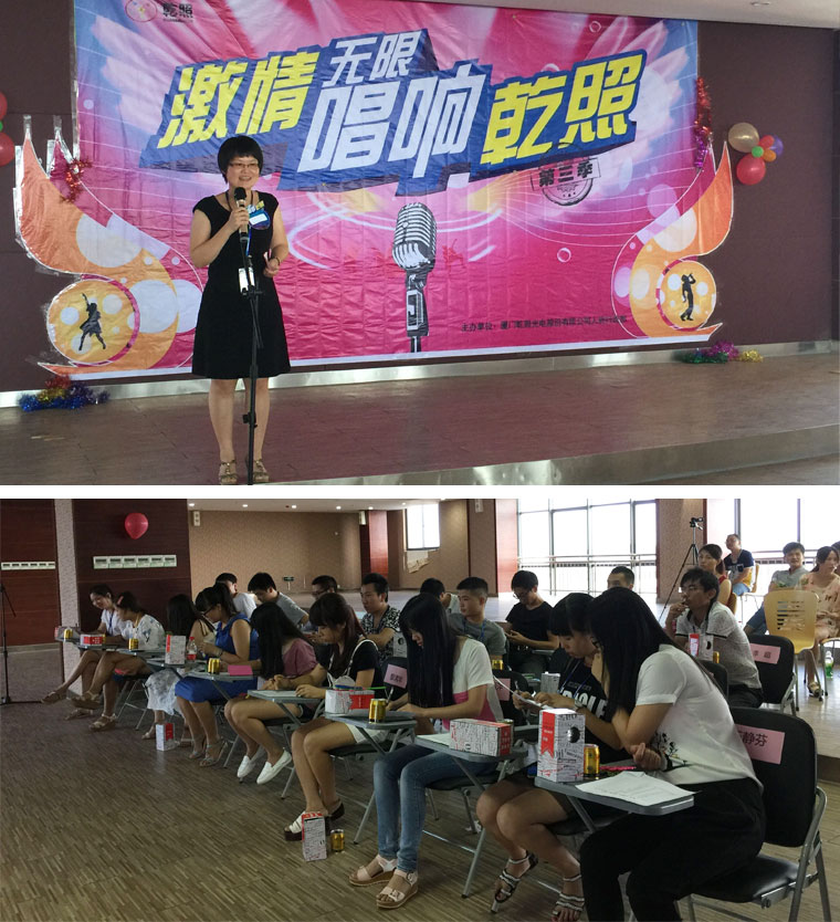 該比賽在辦公樓8樓大禮堂舉行,雖然沒有專業的場地,但負責此次活動的組委會成員各揚己長,設計海報,宣傳報名、布置場地,選拔主持人、拉贊助等,實現了小制作,大實現的效果。組委會還給選手評委準備貼心小禮物,讓大家由衷地感受到他們的用心。本次比賽不僅是為大家提供展示歌唱風采的舞臺,更讓大家感受到了乾照這個大家庭的溫馨,推動了我司員工精神文明的建設。讓我們期待下一季的歌唱比賽吧!