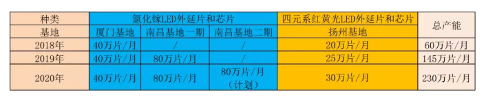 首先分享一下乾照的產能情況。乾照光電南昌基地分兩期共投資50億元。其中一期工程于2018年1月正式動工,2018年12月建成并投產,將新增氮化鎵LED外延片和芯片產能80萬片/月(折合2英寸)。二期工程將根據市場情況擇機動工,將在一期工程的基礎上再增加80萬片/月的產能。