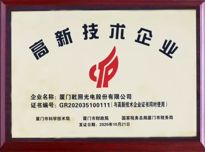 12月,乾照光電收到廈門市科學(xué)技術(shù)局、廈門市財政局、國家稅務(wù)總局廈門市稅務(wù)局聯(lián)合頒發(fā)的《高新技術(shù)企業(yè)證書》,證書編號為GR202035100111,發(fā)證日期為2020年10月21日,有效期三年。公司于2008年被認(rèn)定為高新技術(shù)企業(yè),本次是公司原高新技術(shù)企業(yè)證書有效期滿后進(jìn)行的重新認(rèn)定。這是對公司具有高成長性、較好潛在經(jīng)濟(jì)效益的認(rèn)可,也是對公司具備較強(qiáng)的創(chuàng)新意識、較高的市場開拓能力和經(jīng)營管理水平的高度認(rèn)可。乾照光電將充分發(fā)揮高新技術(shù)企業(yè)的優(yōu)勢和模范帶頭作用,進(jìn)一步提高自主創(chuàng)新的能力,提升產(chǎn)品技術(shù)和質(zhì)量!