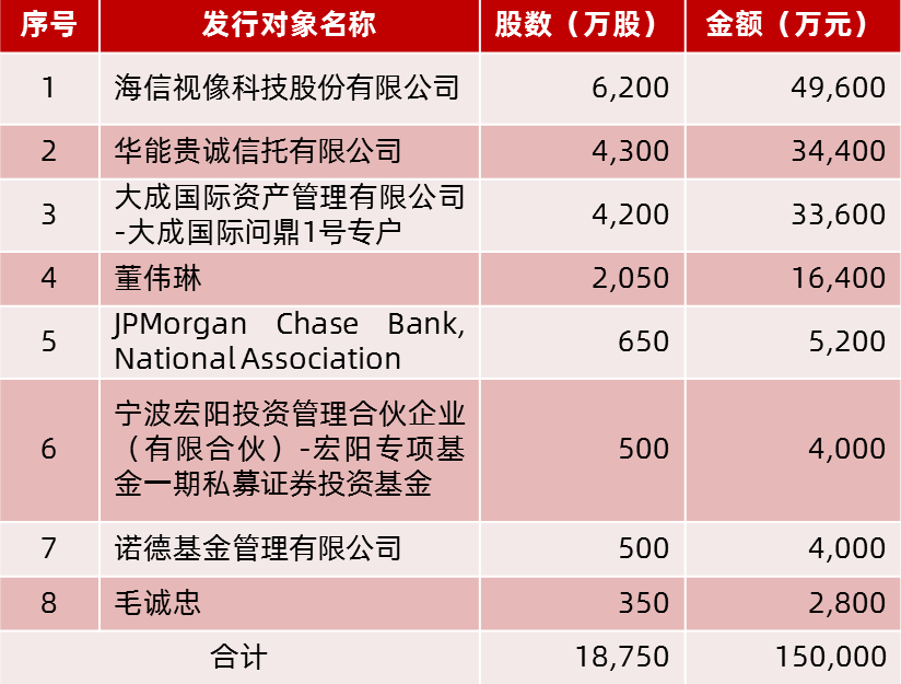 本次發行對象最終確定為8家,發行配售結果如下: